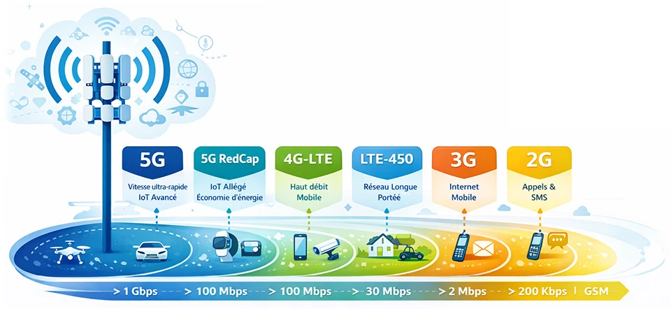 Le LTE 450 se distingue par sa compatibilité avec plusieurs catégories LTE optimisées pour l’IoT et les communications M2M, notamment LTE Cat‑1, Cat‑1bis, LTE‑M et NB‑IoT. Ce réseau offre ainsi un large spectre de cas d’usage nécessitant une latence maîtrisée et une fiabilité élevée : capteurs basse consommation, équipements industriels, etc.